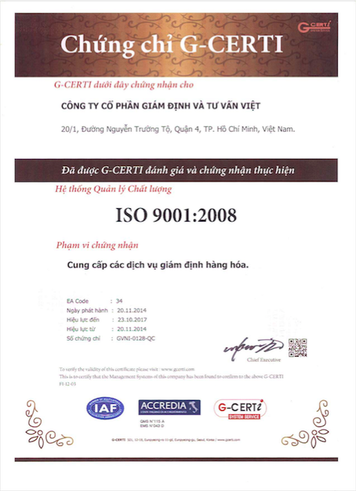 Vietcontrol Hai Phong has built its reputation on the quality and scope of services. Quality is our commitment. This is the individual and collective responsibility of all employees, whose integrity can be relied upon. The tools used to achieve this objective are ISO 9000 & TQM programmers, an improvement in administrative and inspection procedures. To assure clients of our total commitment to quality, Vietcontrol Hai Phong has received ISO 9001 certificate.
