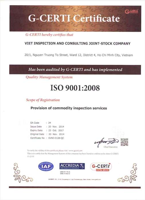 Vietcontrol Hai Phong won the ISO 9001 certificate by Intertek Testing Services USA, DNV &QUACERT. We are currently applying ISO/IEC 17020:1998 to our services and will be certified in the near future. The company provides impartial inspection and surveying for export and import cargoes. With a long history, we quickly became one of the most reliable inspection organizations in Vietnam.